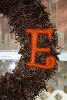 Now for the letter...originally I had chosen big, thick, blocky type script for both my letter and Ginny's. However, I quickly realized that I was going to have a hard time getting it covered in yarn and looking 'clean' the way I wanted it to. I didn't want it to look tacky after all the time I spent on the wreath. I then picked up a smaller letter with thinner font and it was MUCH easier to cover. Take time and play with the yarn and the letter before you begin covering it for real. Once I got a section the way I wanted it I quickly unwrapped it and applied small dabs of hot glue in spots and quickly re-wrapped it. I did this section by section until it was finished. Here's what the 'E' looks like up close.